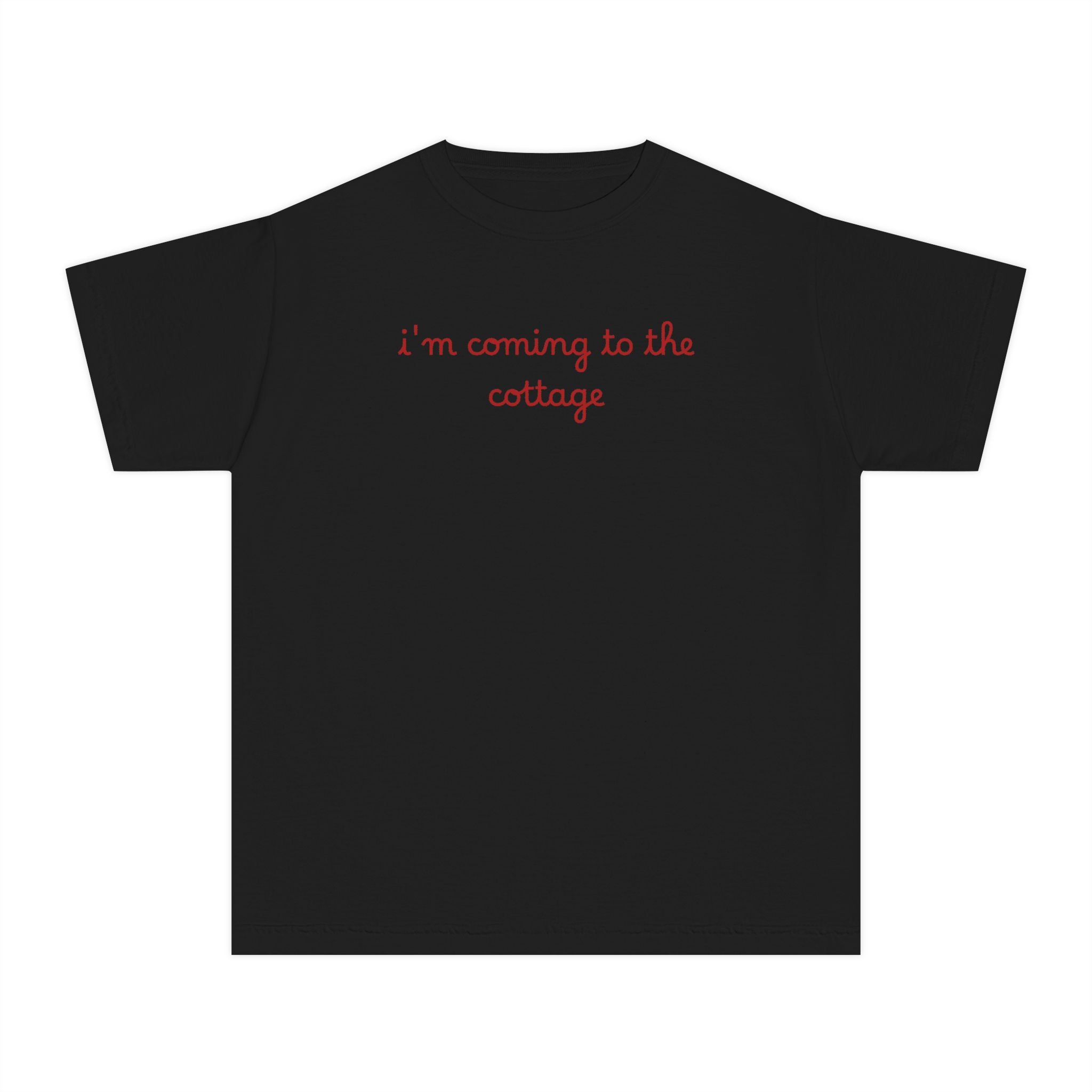 Baby Tee Fit brought by a kids tee sizing (read sizing chart) The black midweight fabric features a small, hand-lettered red script across the chest that reads “i’m coming to the cottage". It sits with a classic, relaxed silhouette—easy to layer over a flannel or wear alone—so it becomes part of routines: coffee on the porch, evening walks with friends, or the drive out of town when you need to breathe. The garment-dyed cotton feels broken-in from the first wear and the reinforced seams keep it looking lived-in without losing shape. For anyone who collects quiet moments and wants their clothing to carry that mood, this tee brings a soft, personal touch.